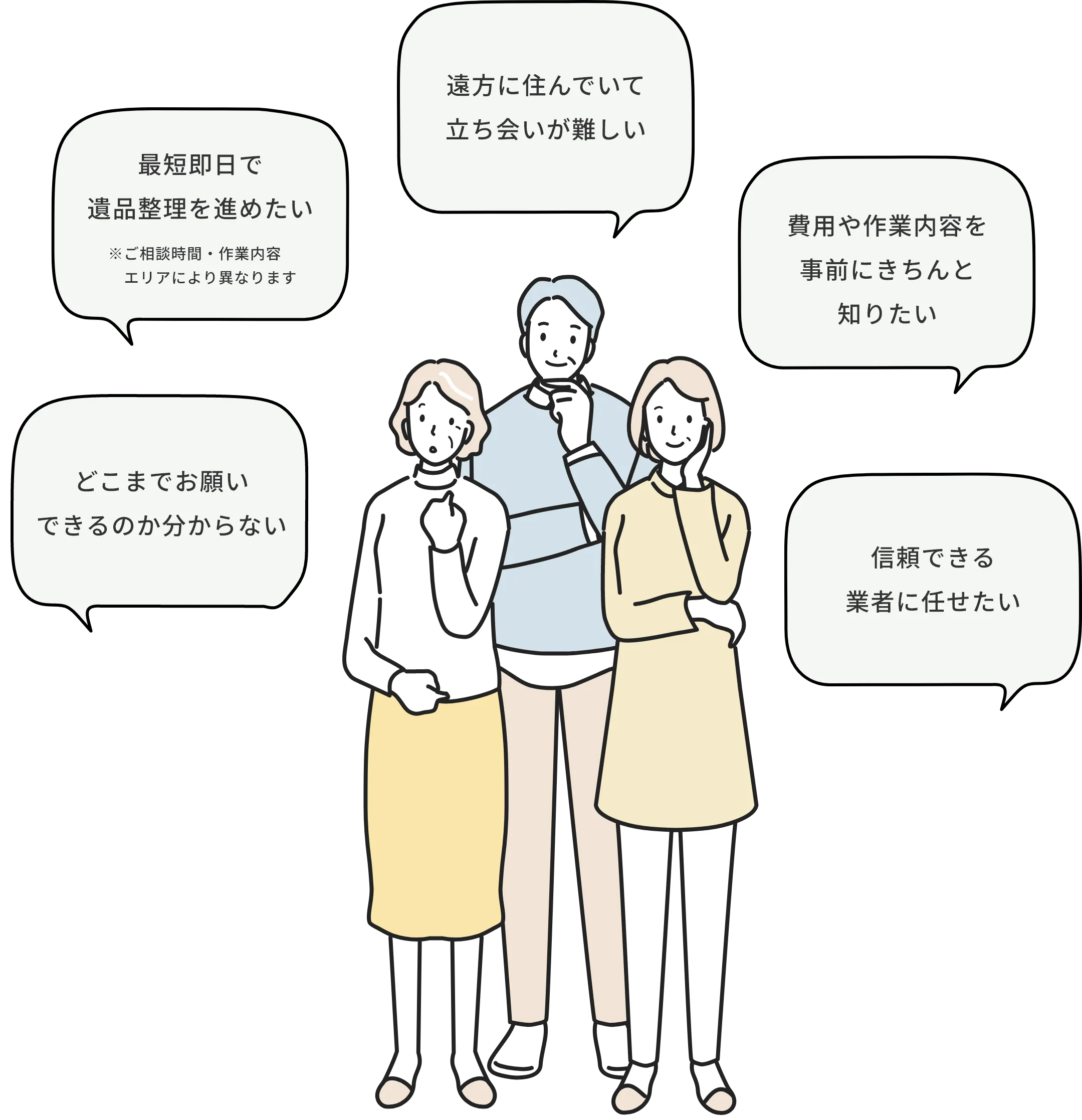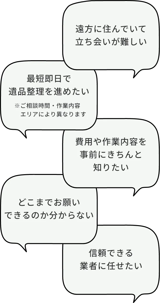 福島県で遺品整理をご検討中の方から、ベストリンクには、ご家族・ご遺族の方からこのようなご相談を多くいただいています。